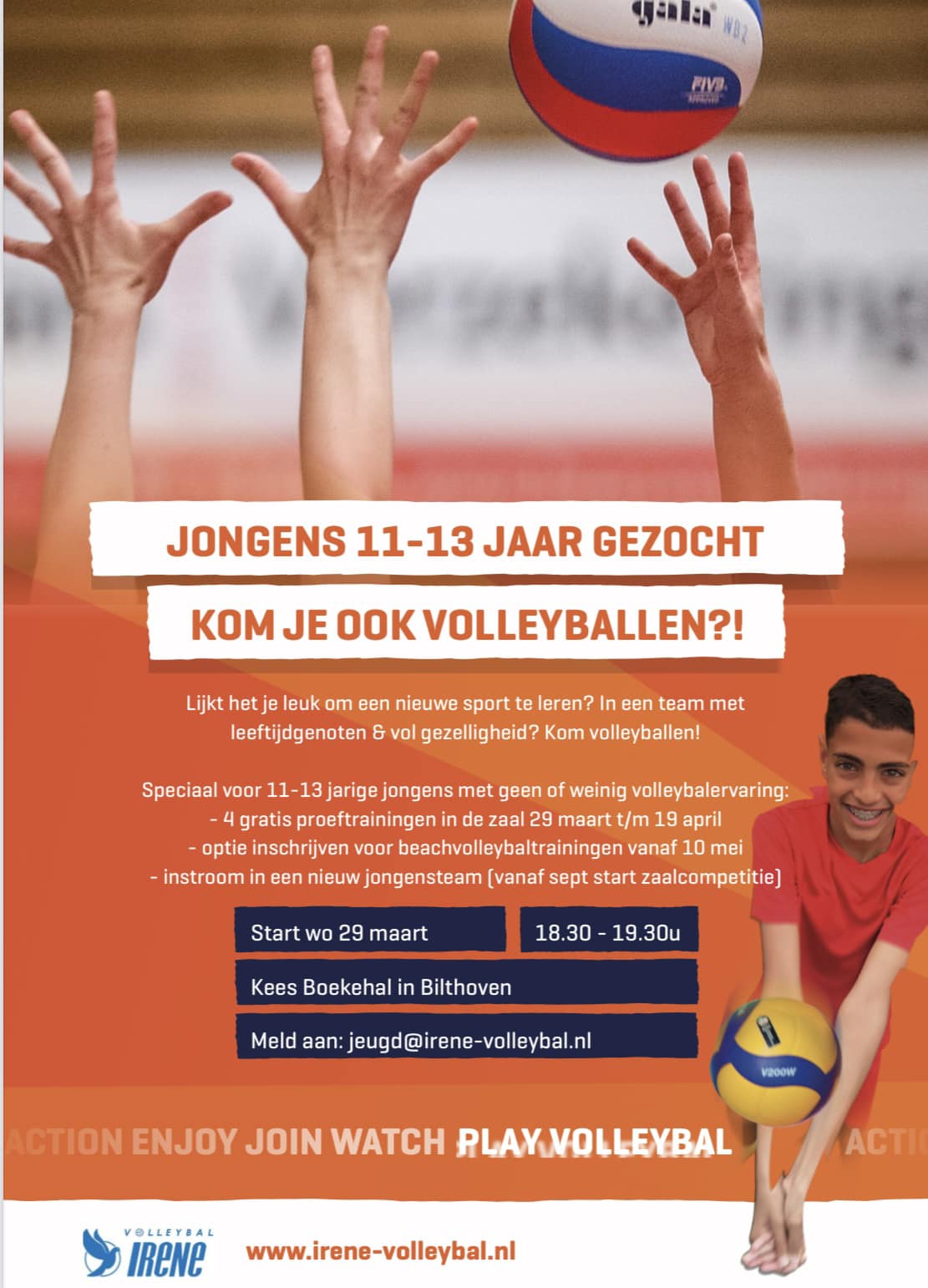 Volleybalvereniging Irene in Bilthoven start een nieuw jongensteam (11-13 jarigen)! Lijkt het je leuk om te kijken of volleybal wat voor je is? Kom vanaf 29 maart 4x meetrainen in een speciale startgroep voor jongens met geen of weinig volleybalervaring!